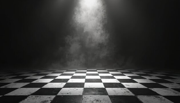 Chess perspective floor background. Black and white chessboard perspective floor texture. Checker board pattern surface. Fading away vanishing checkerboard background. Abstract vector illustration.