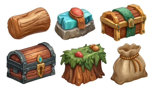Treasure Chest Illustration: Discover the allure of ancient treasures, each adorned with intricate designs and presented with lush tropical foliage, conjuring the spirit of adventure and discovery.