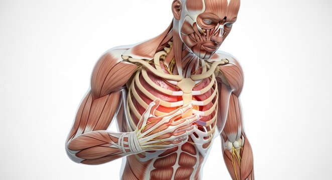 Human Body with Exposed Muscle Tissue and Rib Cage Experiencing Heart Related Pain and Discomfort Illustrated by Red Glow Around Chest Area Indicating Area of Inflammation and Injury