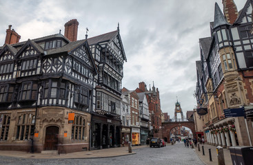9 August 2019: Chester, Cheshire, England, UK - Half timbered houses in Bridge Street in cloudy day