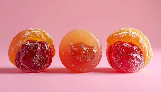 82.A flat-lay of chewy, heart-shaped candies, arranged in a random yet aesthetically pleasing pattern on a white surface, with a soft-focus background that draws attention to their chewy texture.
