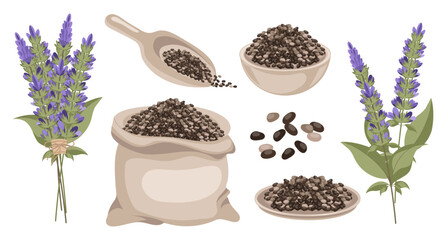 Chia seeds in a linen bag, in a bowl,  in a wooden spoon with a bouquet of chia flower. Salvia hispanica. Spice, condiment, granule or grain. Superfood illustration.