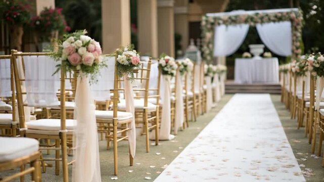 wedding ceremony setup gold chiavari chairs white cushions floral aisle zoom in video