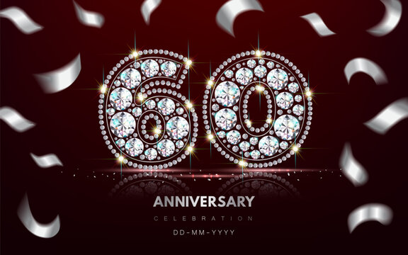 Birthday 60th Anniversary Banner made of Diamond Jewelry and Serpentine Confetti. 3d realistic illustration. Vector.