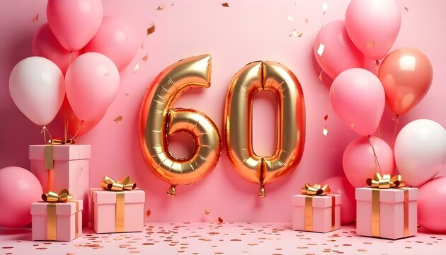 A pink and gold 60th birthday anniversary celebration with balloons and confetti