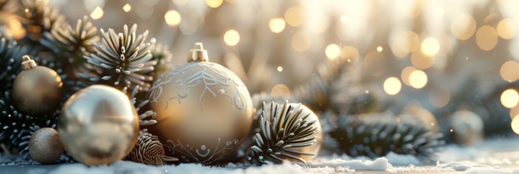 Golden baubles with intricate designs lay among snow-dusted pine, capturing winter's elegance amidst a festive backdrop.