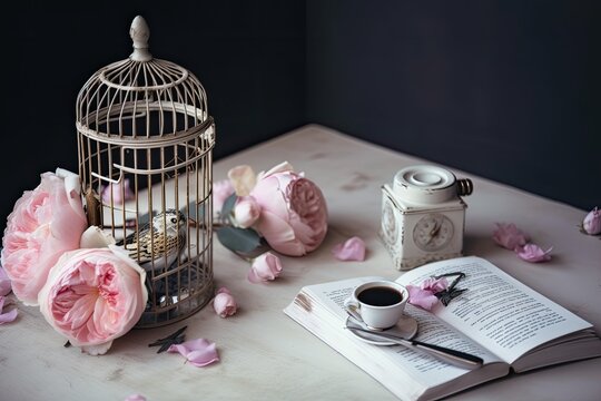 Small coffee cup with aroma, invitation card template with writing area, smartphone with blank screen, and small bird cage with peony flower arrangement. Card and interior are both white provence
