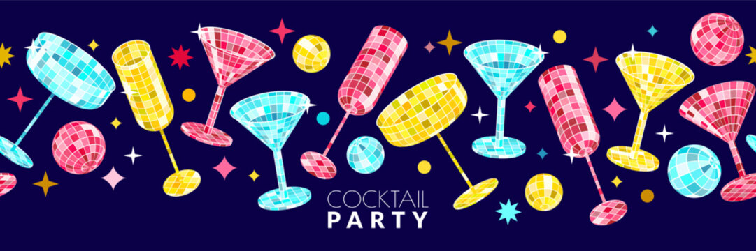 Vector horizontal seamless background, cocktails with mirrored disco ball texture. Night party banner, poster, bar menu