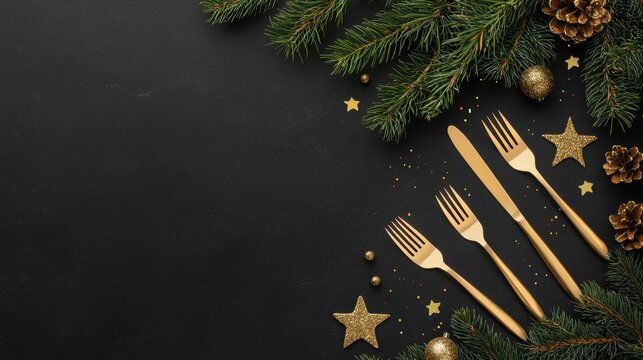 Golden cutlery on a dark stone table, modern and sophisticated Christmas or New Year dining setup. Ideal for banners, menus, and invitations.