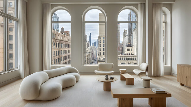 Modern apartment living room with city view, minimalist furniture, and hardwood floors. Perfect for real estate or interior design