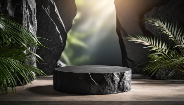 Dark minimalist display podium with rock texture, perfect for product presentation or modern design aesthetics.