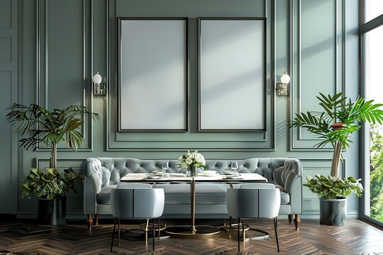 Elegant restaurant interior featuring stylish furnishings, lush greenery, and a sparkling chandelier illuminating the space