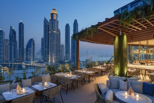 Craft a futuristic restaurant interior, featuring sleek stainless steel surfaces, LED accent lighting, and transparent acrylic chairs, projecting an avant-garde ambiance."