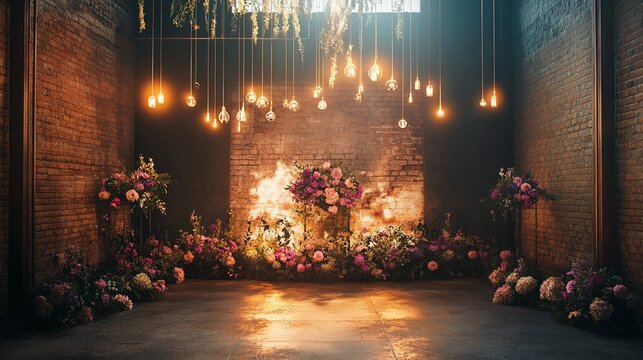modern industrial wedding venue, with exposed brick walls, chic floral arrangements, and a glowing altar under hanging lights
