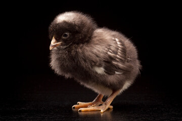 A young Barred Rock chick on a black background