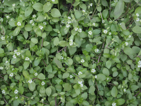 Full frame texture background view of common chickweed flowers (Stellaria media) with tiny white flower blossoms and edible green leaves. Often considered a weed in lawns.