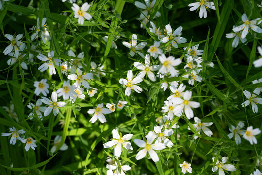 Sunlit chickweed flowers in full bloom, highlighting plant development and seasonal change