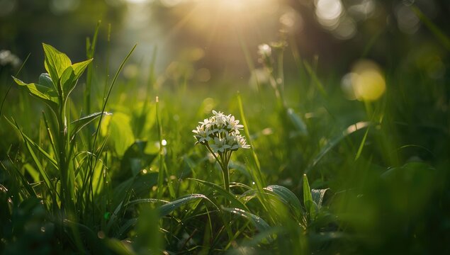 A delicate white flower with five petals, possibly a chickweed or starwort, blooms in a vibrant green meadow, captured in a close-up shot with a soft, blurred background, highlighting the beauty of n.