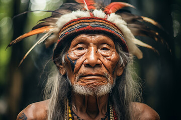 Generative AI image of an elder Amazonian tribe chief with a feathered headdress, tribal face paint, and traditional jewelry, deeply gazing into the camera