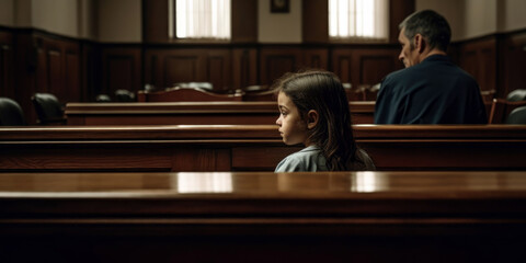 lonely child in a courtroom, the field of child advocacy (created with Generative AI)