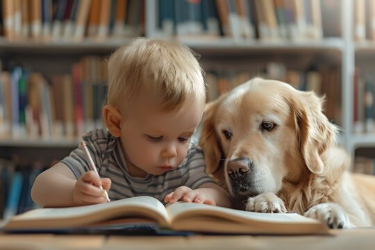 Reading therapy with a dog for children with disabilities and developmental differences. A little boy reads to a guide dog. The dog helps the child learn to read.