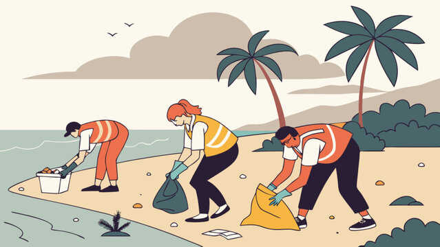 Volunteers are cleaning up the beach, collecting trash and plastic waste to protect the environment and conserve nature, a community effort illustration