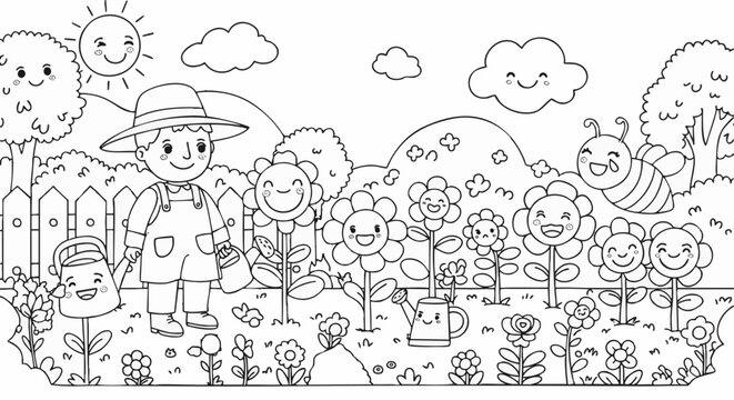 A cute cartoon child gardener in a spring garden with smiling flowers and a happy bee. Black and white vector coloring book page for kids.