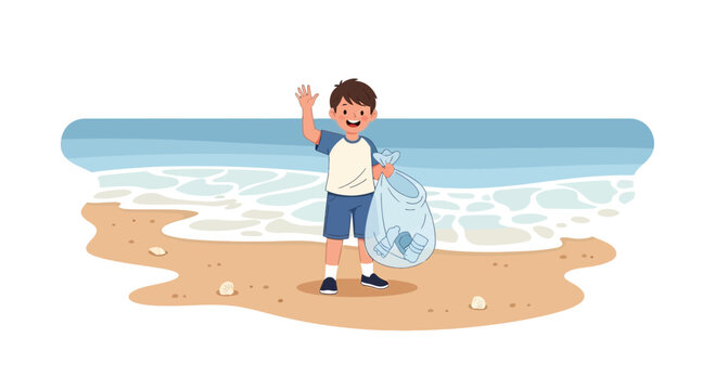 Boy cleaning up beach, supporting environment, and showing a bright smile while waving