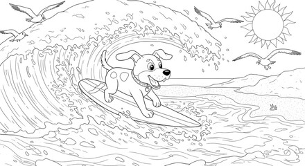 Happy cartoon dog catching a big ocean wave on a surfboard, a fun summer beach scene coloring page for children