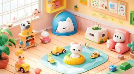 Isometric artwork for kids featuring colorful animals in a playful room filled with toys and a vibrant table setting