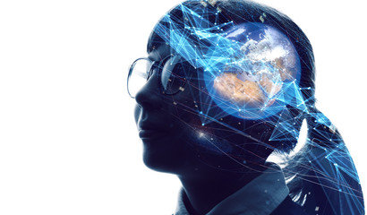 Child studying world map, vintage style, inspiration
