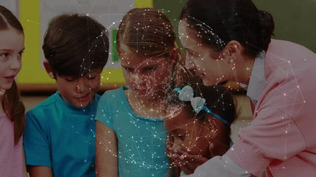 Teacher opening laptop for interactive learning guiding child pressing key as network globe pulsing