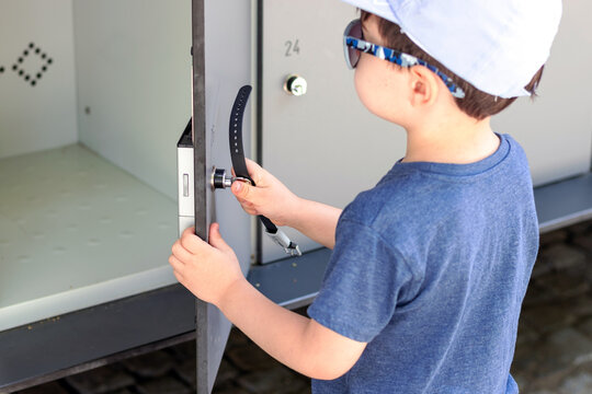 Child unsupervised plays with cabinets. Danger for the baby to pinch the hand of the cabinet door. Protect children from home furniture kids safety. Selected focus