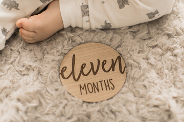 child sitting next to an eleven month milestone sign