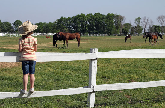 A child feeds horses on farm. little girl give food sugar on hands stallions in zoo. Ranch with horses and small child. Children play with pets. Childhood on farm in countryside. friendship with pets