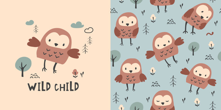 Сhildish pattern with cute owl, baby shower greeting card. Animal seamless background, cute vector texture for kids bedding, fabric, wallpaper, wrapping paper, textile, t-shirt print