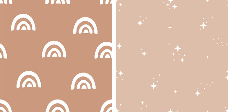 Hand drawn cosmos pattern set. Cute planets, stars and spaceship abstract patterns. Perfect for kids fabric, textile, nursery wallpaper. Vector illustration.