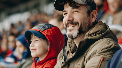 A father and son smiling and enjoying a sports event in a crowded stadium, dressed warmly in jackets and hats. Perfect for themes related to family bonding, sports, and outdoor activities.