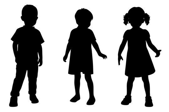 Silhouettes of children different poses standing together in row. Kids various activities hobbies and sports vector silhouette set collection.