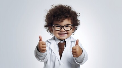 A happy multiracial child dressed as a scientist posing with a thumbs up on a white studio background, Generative AI