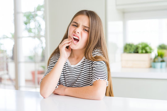Beautiful young girl kid wearing stripes t-shirt touching mouth with hand with painful expression because of toothache or dental illness on teeth. Dentist concept.