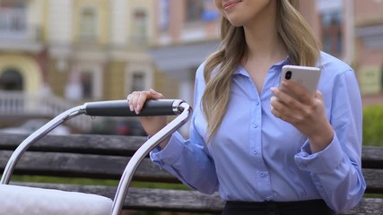 Responsible mom buying quality goods for infant by cellphone, smart choice