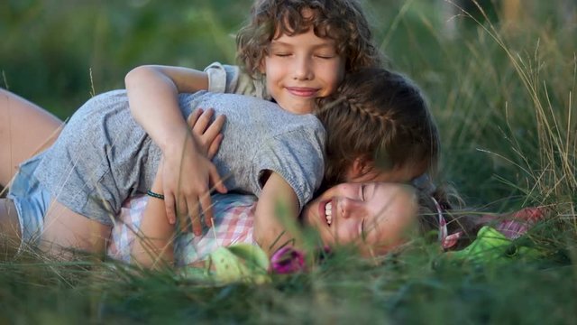 Adorable little girls plays on the playground. A children slides down a slide. Happy childhood concept