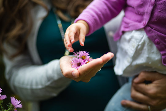 Toddler reaches for flowers