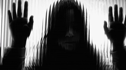 Silhouette of one Sad child struggling with mental illness leaning on defocused glass window. Little girl depiction of depression in childhood, monochromatic black and white