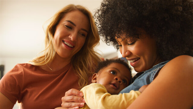 Two Women Joyfully Interacting With a Baby in a Cozy Indoor Setting
