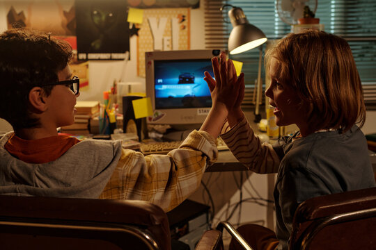 Children sitting at desk high-fiving each other near retro computer screen with dim room lighting creating a nostalgic atmosphere