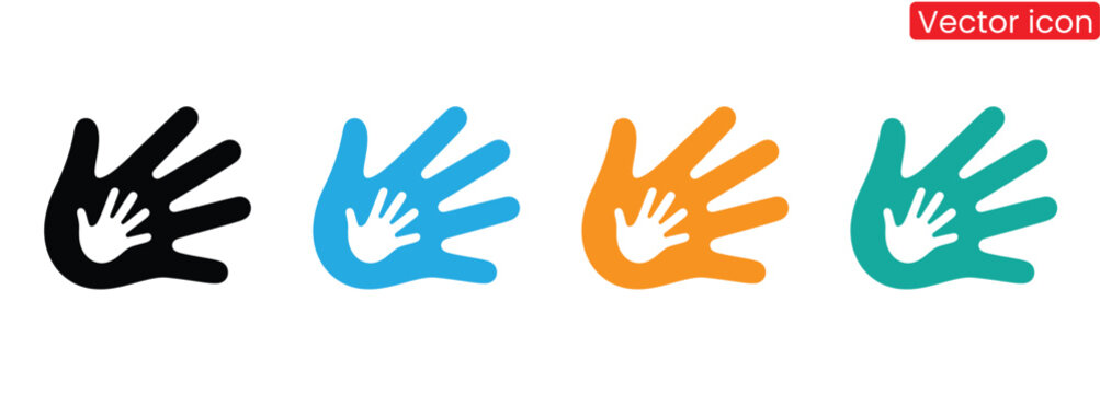 Colorful hand prints representing childhood support design,Charity icons set. Collection of hands, donations, hearts, unity and more. Vector illustration. Easily changes to any color.