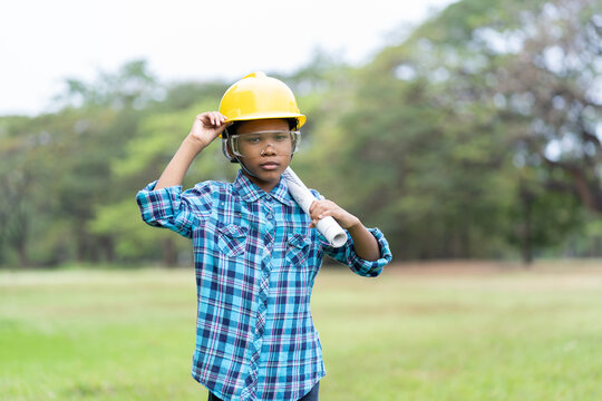 African American child boy in engineering holding construction blueprint and wearing yellow safety helmet outdoor in the park. Education concept