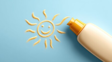 Sunscreen Bottle Next to Childlike Sun Drawing on Light Blue Background